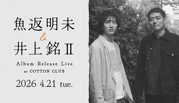 4/21(火)東京・COTTON CLUBにて魚返明未&井上銘のアルバムリリースライブが決定しています。